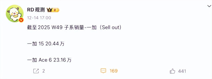 一加15与Ace 6分别取得20.44万和23.16万台的销量。一加15锚定高端性能市场,Ace系列收割中端性价比用户,这一产品矩阵思路清晰。尽管从销量数字上看,一加与红米、iQOO存在差距,但其近期动作显示出强烈的追赶势头。